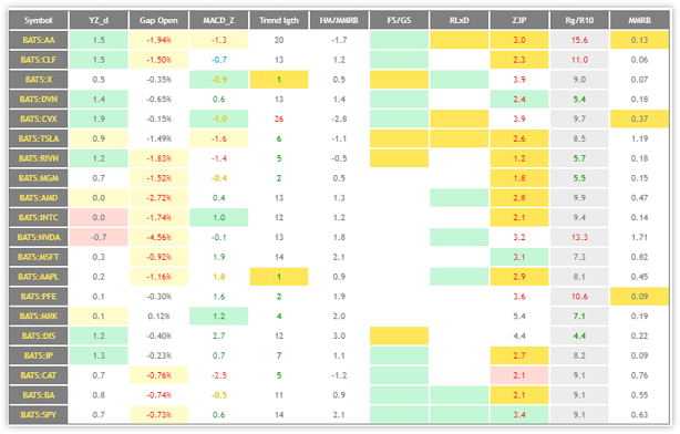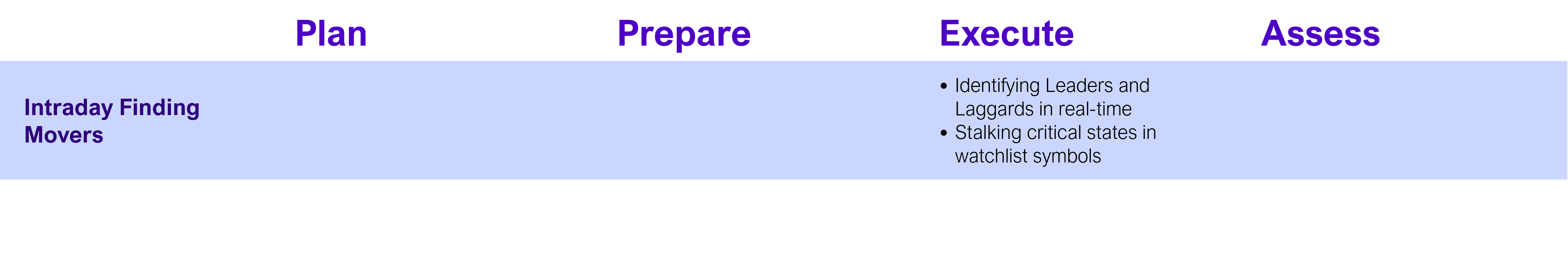 Powerful streamlined layout to help you focus on detecting which symbols of your watchlist are in play in realtime during various stages of the intraday Trading session. Informs you about which symbols to start stalking next for potential entry Signals.